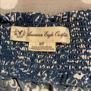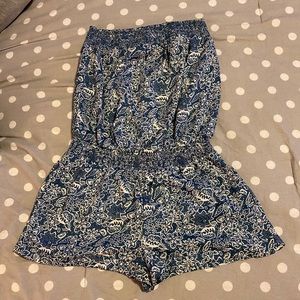Blue romper with pockets and white flower type pattern