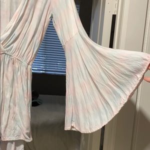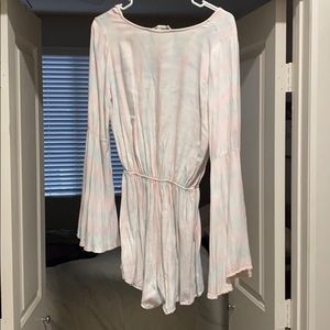 Long sleeve, faded tie-dye romper with shorts. Bell sleeves and low cut in front.