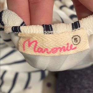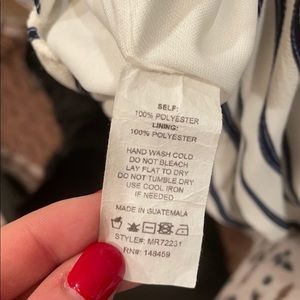 Navy blue and white striped romper. V-neck. Straps are not adjustable