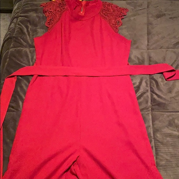 Red romper with lace shoulder sleeve. Size small. Never worn