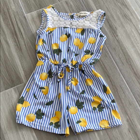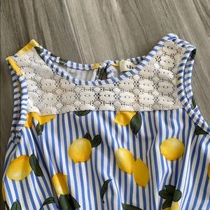 This romper has white with blue stripes and lemons. Nice cool material no stains and in good condition.