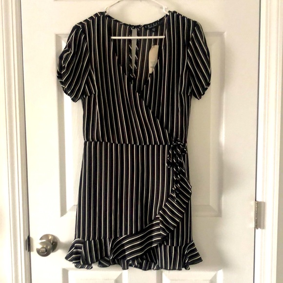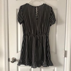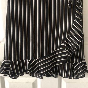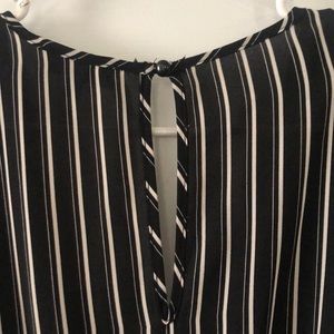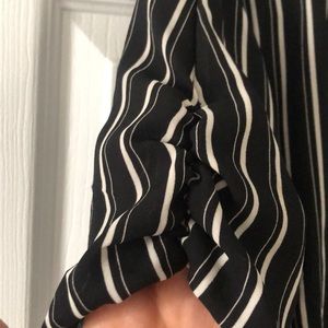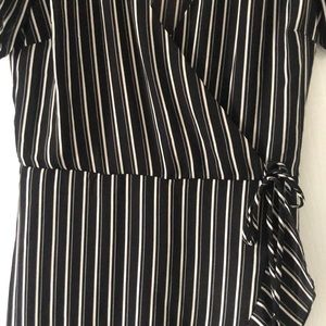 Black with white pinstripes. Faux wrap top, full skirt over shorts bottom with side waist tie. Ruched shirt sleeves. Keyhole back. Elastic waist in the back.