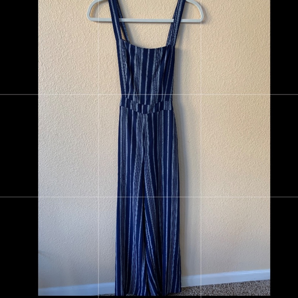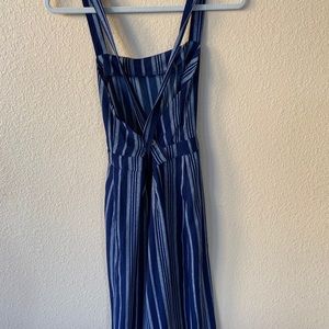 Blue romper and has a white striped pattern. Has never been worn before.
