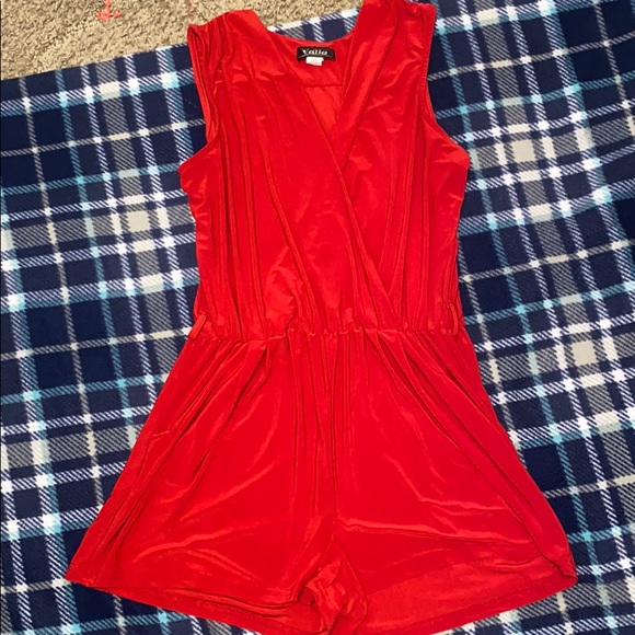 Bright red romper, Sinched at the waist and has pockets!!