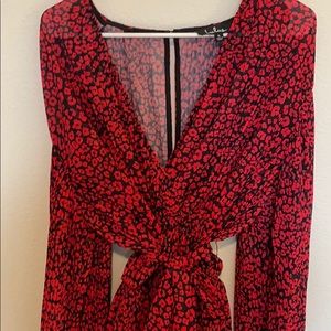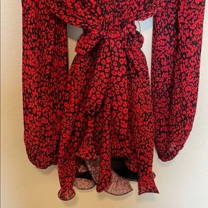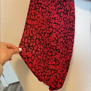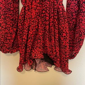 Balloon sleeve black and red leopard print romper. Fabric has tiny pleats all over