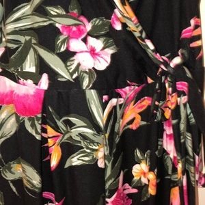 V neck romper with tie in front. It is black and has pink flowers and greenery. It has been worn once. Price is negotiable