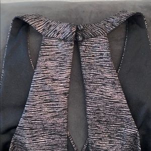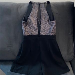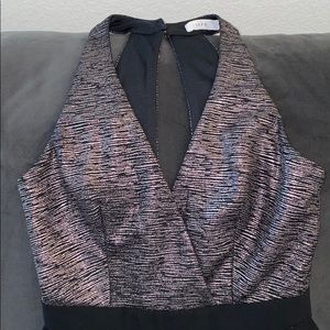 Black romper with sliver detailing on the top, with an open back (pictured), zippered bottom (pictured)