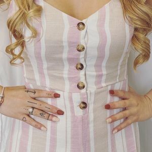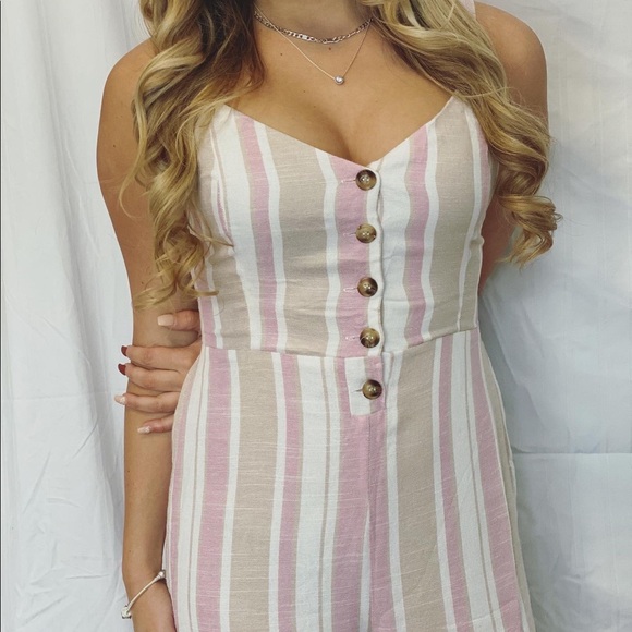 The colors for this romper are so soft kit like it’s fabric! There is a cute button up in the front, a self-tie in the back, and a wide legged pant. Snag it quick before it sells out!