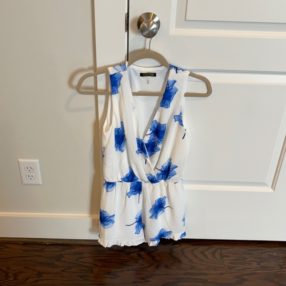 This is the cutest little white and blue floral romper! Has little ruffling detail on the bottom! Size small