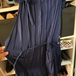 Tie sleeve romper in blue with pockets and side buttons