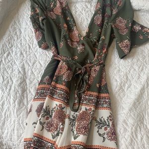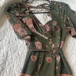 Really pretty olive green with a zipper closure in the back tie on shoulders and tied belt