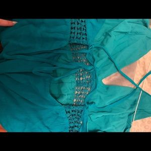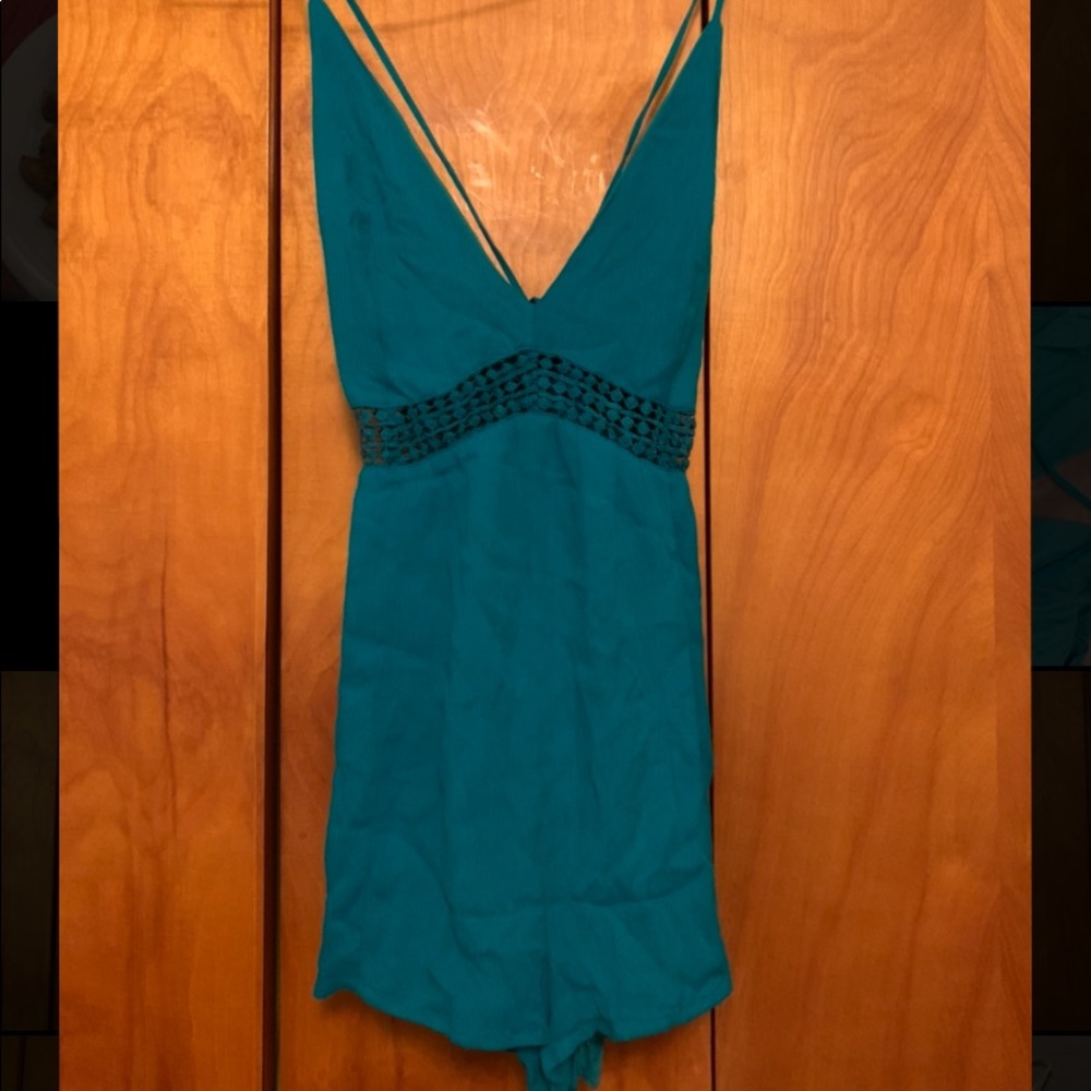 Turquoise romper. Tie adjustable straps. Also a zip in the back. Comfortable. Worn once. Great shape. Size medium but I am usually a size XS/ S and it fits good.