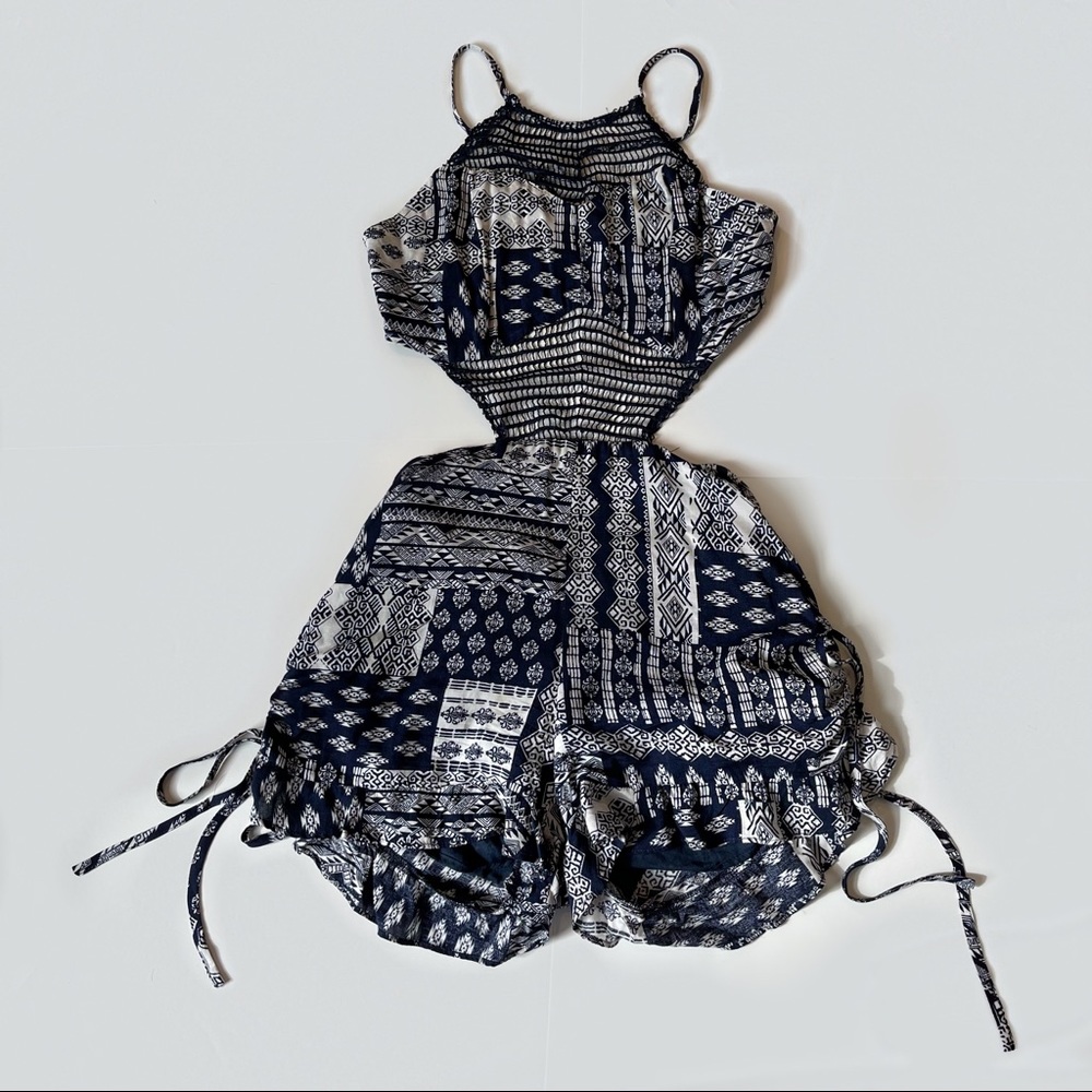 Never been worn! Open back romper with elastic band around the waist to keep from following down low, helps it to stay in place. Cream and navy blue are the colors of this romper. This romper is from The Boutique, a very well known established boutique in Miami!