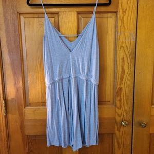 • light blue romper • worn once • drawstring waist • pockets • spaghetti straps • size M