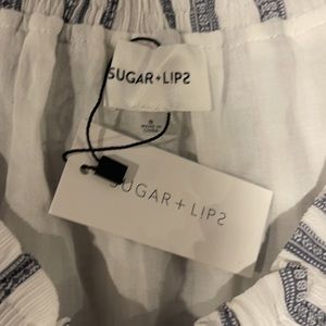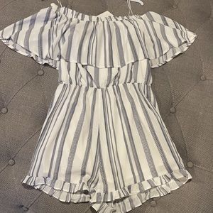 This is a super cute romper which almost appears as a dress. The top is versatile, you can wear it on or off the shoulders. I would say this is true to size. Personally I wear a small, but typically need to go up a size in all rompers because I have a longer torso than most (so I kept a medium for myself). The bottoms is ruffled. The strips are grey and aligned for a flattering look. The brand is sugar lips. 98% polyester & 2% spandex. The best part of this romper is it has an underlining white layer inside, so it’s NOT see through!