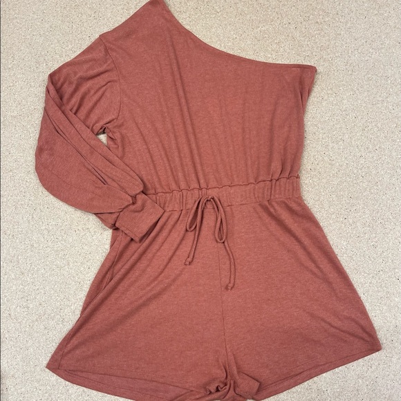 NWT! Burnt orange colored romper with one long sleeve. The waist string is just decorative and does not cinch! Great for tall girls!