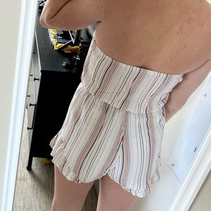 Strapless romper. White with colorful strips. The bottom half has a second layer of white to prevent from being see-through.