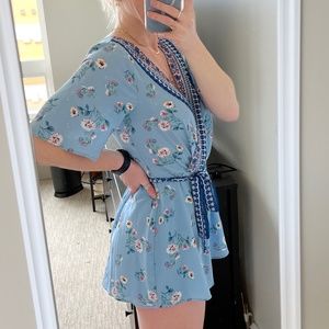 Blue floral romper. Breathable material with shades of blue and pink flowers throughout. Original purchased from Francesca's.