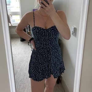 Navy blue and mint polka-dots romper. Flows very nicely that it almost looks like a dress but has the comfort of being romper. Never worn however the tags are off. Very supportive and patted in the front.