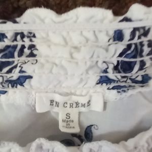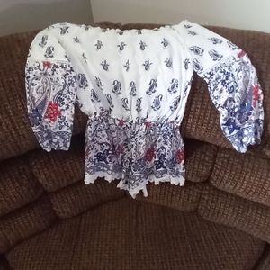 size small rompers by en creme. long sleeve with relaxed shoulder fit. adorable pattern and fit