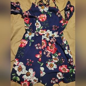 Floral Off The Shoulder Romper. Brand is Yoyo 5. Size medium. Fabric is 100% Rayon. Strings are adjustable and tie in the front. Condition is used but good. Slight threading exposed as seen in pictures. Looks really cute on, shorts are a little short.