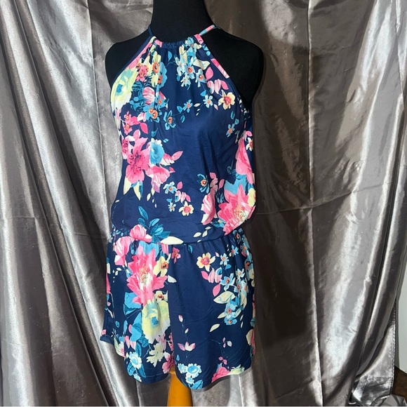 Navy blue with floral detail. Elastic waist with front pockets. You can adjust the drawstring at the neck to widen the opening of the front and back keyholes. Very cute. I bought this from a local boutique but never worn it. I can’t find a tag in it anywhere, it fits like a medium