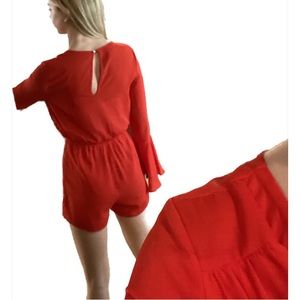 Long sleeve romper with shorts. Open front with button around the neck in the back.