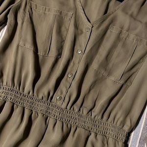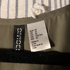H & M olive green romper. Worn once! Says size 10 (fits like an 8) it is sheer so you would have to wear a beige tank under and beige undergarments. It’s super cute on!!!