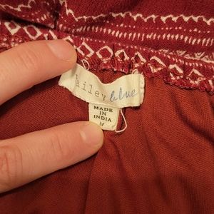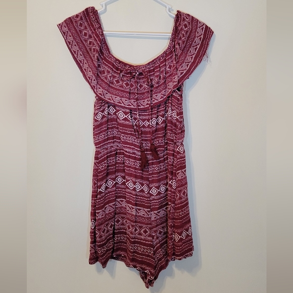 Off the shoulder, top ruffle, maroon romper.