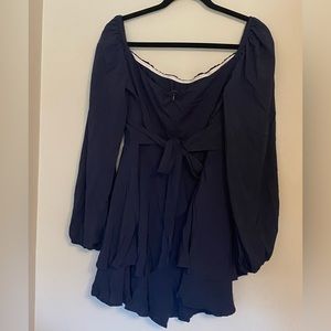 Navy blue long sleeve romper, ties behind the back, zipper on the back, can be worn a bit off the shoulder, size XL, boho inspired, never worn