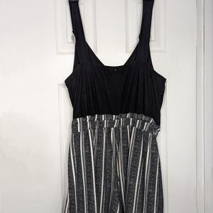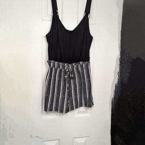 size M romper, wear out with sandles or dress down with sneakers. If you look at the back side of the romper that white spot is a hole where the label was, easy fix!