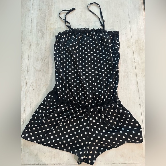 Adorable vintage feel romper with lace details and adjustable shoulder straps. Pair with your favorite jean jacket and sneakers for a fun look or keep it simple with a cute pair of sandals! No size tag. My best guess is extra small/small.