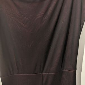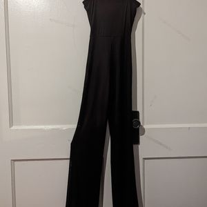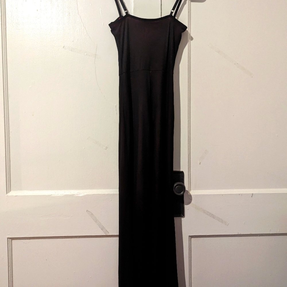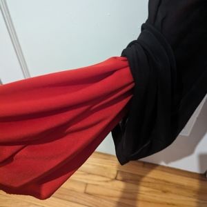red fabric with black sheer on top. long flare legs and adjustable straps