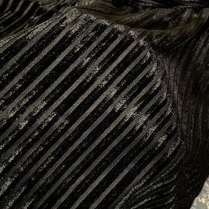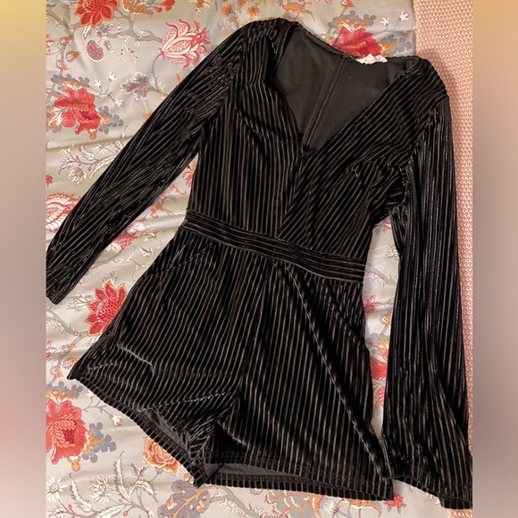 Black romper, used condition but no holes or tears. Bell sleeves, velvet striping. Not see through.