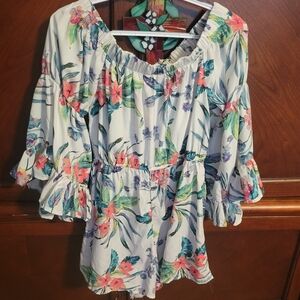 white floral ruffle sleeve romper polyester