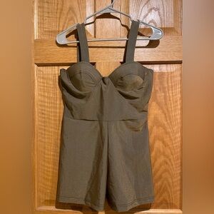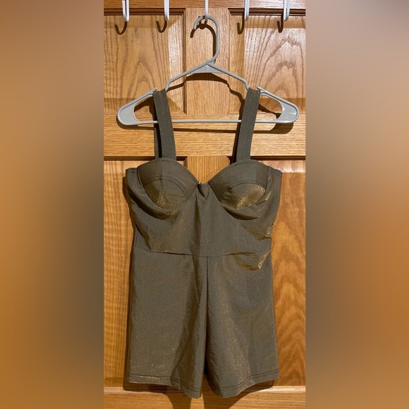 This is a beautiful shimmery sage green romper it is made out of stretchy material. And shapes curves nicely. No brand for this romper and it is One size fits S - XL. Brand new no tags never used.