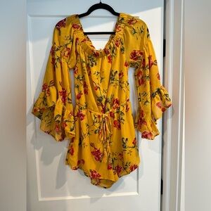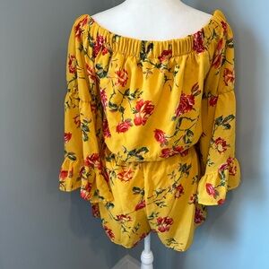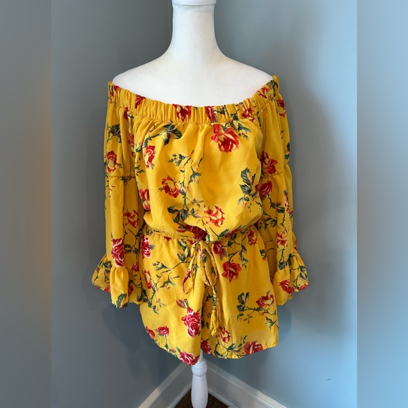 Brighten your wardrobe with this stunning floral off-shoulder romper. The vibrant yellow fabric is adorned with beautiful red flowers and green leaves, perfect for any occasion. Charming flutter sleeve. Stretchy, pull on. Stretchy waist with decorative tassel tie. Fully lined.