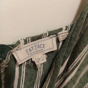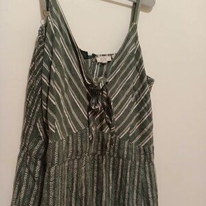 Sage green romper with white pin stripes and super cute V-neck.