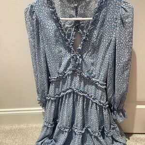 Stylish blue romper featuring delicate ruffles and a charming pattern. Ideal for any event.