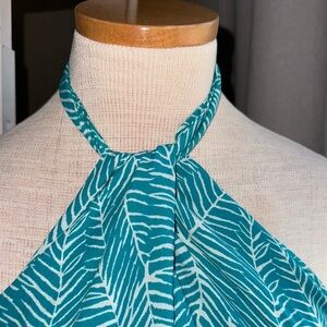Stylish teal romper with halter neck. Features a leaf pattern. Perfect for casual outings.