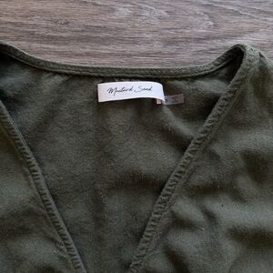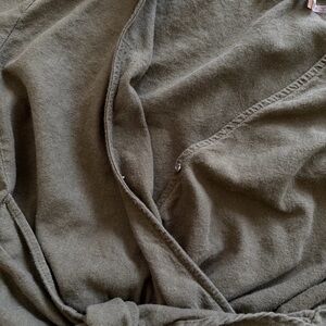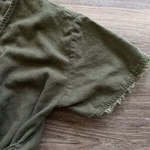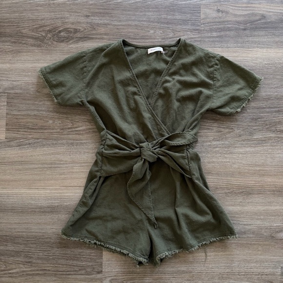 Olive romper from local boutique - mustard seen brand. Tie can go in front or back! I think I only wore this once & no longer fits after pregnancy. It’s SO cute!!