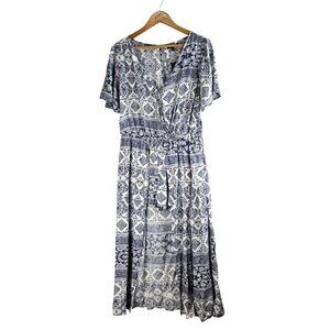 Romper dress by Hype in a midi length skirt and open front. Soft rayon in a blue and white floral/geometric pattern and elastic waist. Great for beach time, vacation and special occasions. New with tags, no sign of wear.