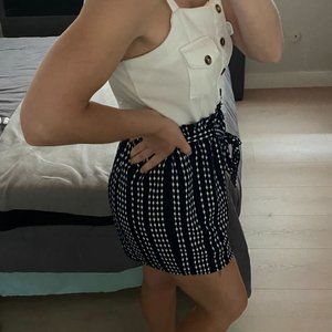 Casual sleeveless romper, shorts, navy with white polka dots.
