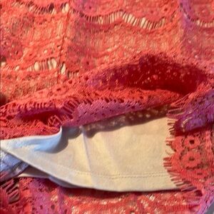 Cap sleeves add coverage.100 percent polyester fabric is super lightweight and breathable. Shorts hit at around the top of the thigh. V-neck shows off your collarbone. Fitted design hugs your curves. Super fun and flirty, this Women's Lace Capsleeve Romper . The lacy pinkconstruction adds a sweet, girly spin to this great piece. SZ L New With Tags