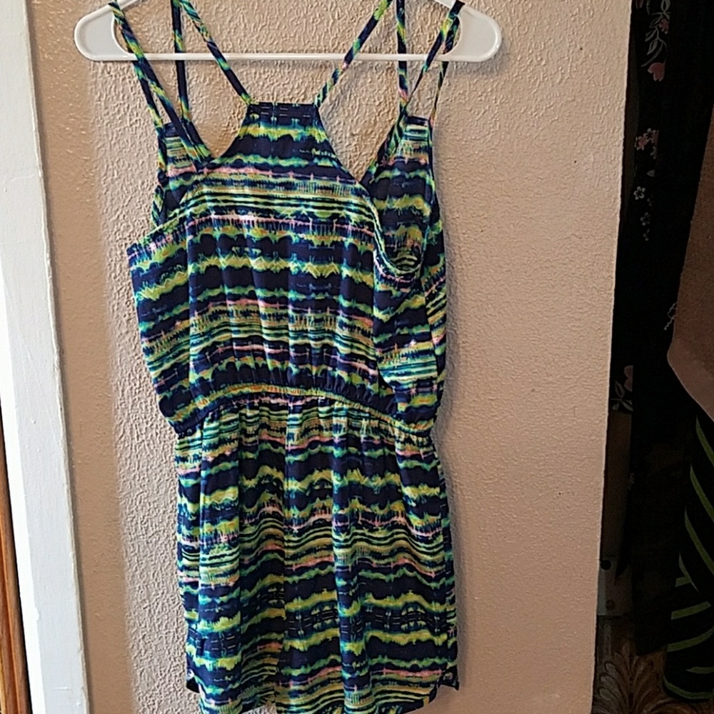 Blue Romper, BeBop, size medium yellow unknown if it's about a medium. Yellow Romper, Ali & Kris, buttons up the front and has adjustable straps with a yellow mesh middle.
