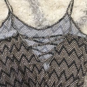 Size small romper made of very soft and comfortable fabric with tan and black chevron pattern . The back has a cross cross design