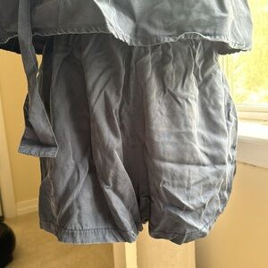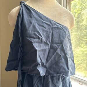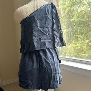Stylish one-shoulder blue romper. Perfect for casual outings and fall ball games!!! Just needs a little ironing!