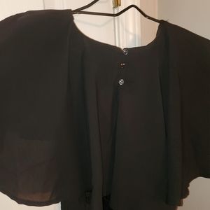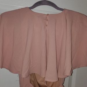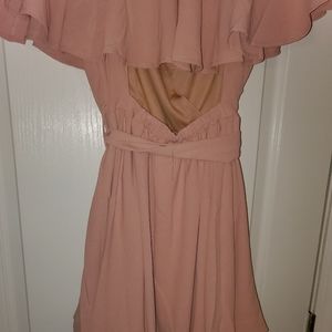Sexy romper/dress with shorts under the skirt. Sexy v-neck with an open back and a belt that ties around the waist.