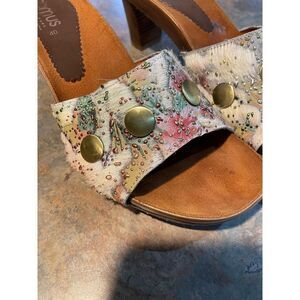 These are so unique and cool! They are a 2 1/2” wooden heel, slide on clog adorned with fur and gold accents. They have very minimal wear as you can see in the photos. The only thing to point is left heel where the tag was removed and a small stain..both minimal but I like to disclose all.