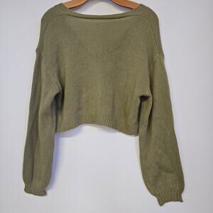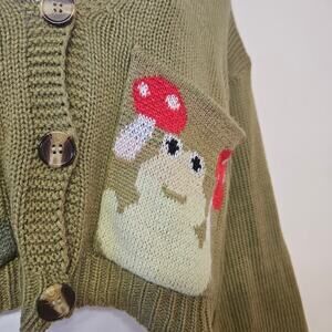 Romwe crop sweater is in great condition. It does have some wash wear. This adorable sweater features a playful green frog and mushroom design with a button front. It has two pockets in the front.